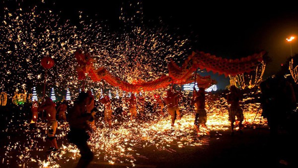 龙灯舞。为民间传统舞蹈,又称"龙舞"、"龙灯"、"耍龙"等。据说始于汉代。每年正月初一至十五日舞龙灯。龙形品种多样,有"彩龙"、"火龙"等。彩龙龙头五彩缤纷,龙身以各色软段制成,约9至10余节,造型精美。舞时常配以鱼虾蚌壳等彩灯同行。舞龙者不分男女,皆着对襟彩服,系红腰带,手持一节把竿,伴着打击乐随逗宝人曲身翻舞,绵延不停。火龙多用彩龙头,龙身着彩绘龙鳞的粗麻布,每节内有竹笼,内置燃烛或捻子,舞时点亮。火龙较彩龙长、大,一般10余节,把竿也较长,龙把竿长约2米,舞火龙者头戴草帽、穿小裤衩、赤脚光背、持龙游舞,四周燃灯者手持鞭炮、拌以铁花、炭圆,向火龙喷射。只见火花飞溅,火龙翻滚,火光冲天,五彩缤纷。待至龙体被焰火燃烧正旺时,舞龙者举起龙架跑至江水,意为送龙归海。因多在元宵夜举行烧龙仪式,故名"火龙",元宵烧龙,象征新年庆祝活动圆满,借以祈求"清吉平安"。