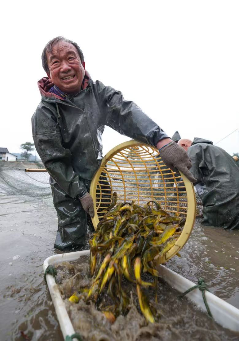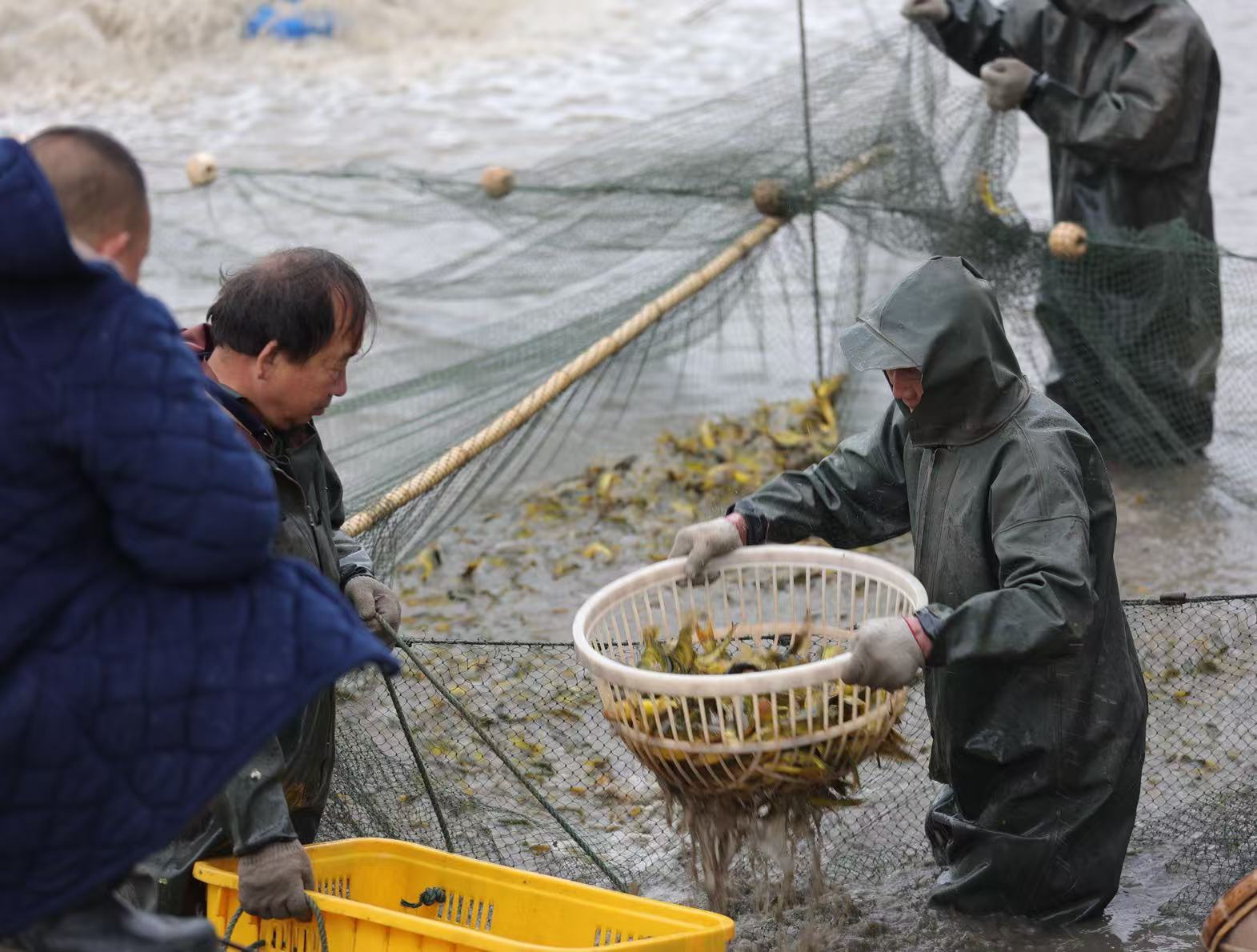 随着渔网缓缓收紧,水面上泛起层层波纹,水中的黄辣丁争相翻腾跃起,水花四溅,一条条肥美的鱼儿在网中跳跃,渔民们将鱼儿装进框里,随后进行转运、称重、装车。