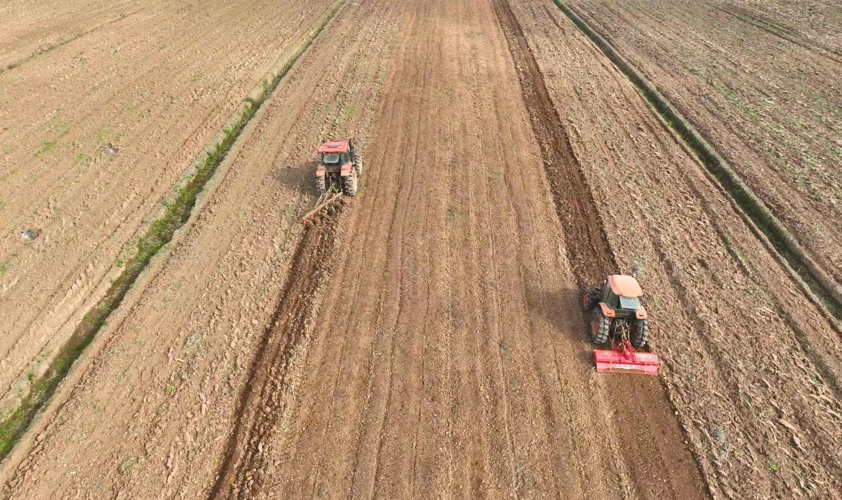 2月20日上午,在石洞镇双祠堂村奉光荣种植家庭农场的大豆玉米带状复合种植基地,两台农机在地里来回穿梭。不一会,一块7亩大小的土地便旋耕完毕。