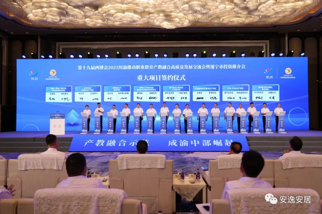 在第十九届西博会2023川渝推动职业教育产教融合高质量发展交流会暨遂宁市投资推介会上,安居省级经开区与绝味食品股份有限公司签约《绝味食品(遂宁)二期年产两万吨休闲卤味制品项目》。此次项目的成功签约,将为安居持续巩固壮大特色食品及特色消费产业,推动产业接一连三延长发展链条,加快打造“一个千亿产值园区、三大百亿产业集群”注入新动能。此外,上海鹏泽海新能源集团有限公司(遂宁)也在西博会上与安居签约10万吨/年废旧锂电池资源化综合利用及锂电池新材料生产项目,总值30亿元。