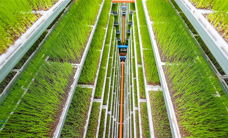 走进三家大米育秧中心,映入眼帘的是一盘盘生机盎然的秧苗。随着链条转动,循环运动式苗床上的秧盘,从上到下循环变换位置,接受水肥一体化喷灌系统的“洗礼”,每一株苗叶面都实现了均匀补水,处于相同的光照和最适宜生长的环境中。