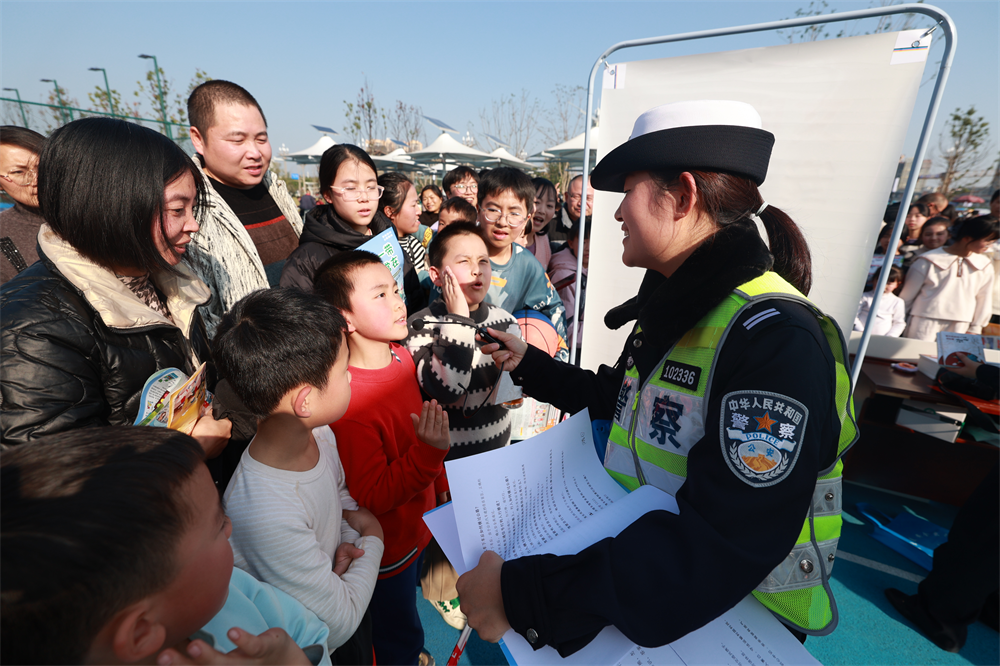 活动中,民辅警通过现场悬挂宣传横幅、摆放主题宣传展板、发放宣传资料等方式,宣讲道路交通安全知识,倡导“文明交通 携手共创”交通理念。当天,还通过互动问答小游戏,将“知危险会避险”“一盔一带 安全常在”“拒绝酒驾”等安全理念融入到问答中,让群众在积极参与问答活动的同时,将交通安全知识牢记心中。