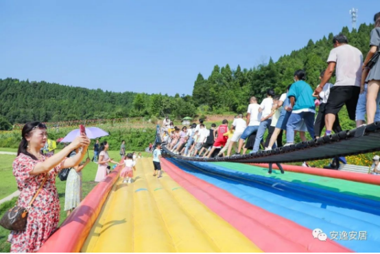 七彩明珠,位于318国道四川遂宁船山区至安居区玉丰镇鸡头寺村境内,按照国家4A级景区标准建设。景区规划面积9428亩,是依托原有森林资源,融丰富多样的丘陵山地、优越的生态环境、优美的乡村田园风光与西南最大的拓展训练中心、观光自行车及体验乡村风味的一流生态文化旅游综合体。国庆期间,在梦幻七彩游乐园内,正是一派热闹非凡的场景,摩天轮、碰碰车、自旋滑车等娱乐项目深受游客们的喜爱,现场一片欢声笑语。