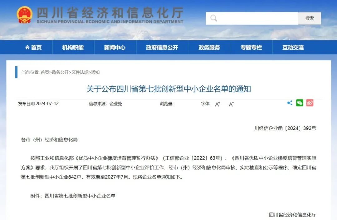 公布了四川省第七批创新型中小企业名单