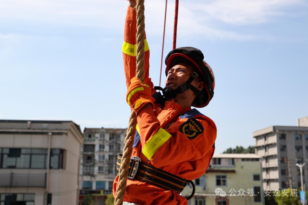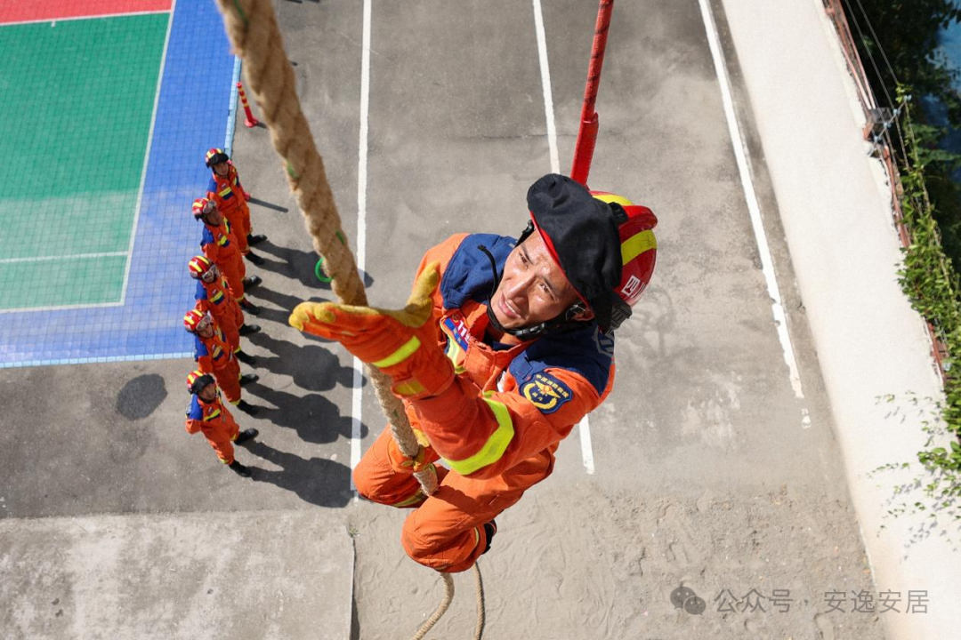 这是消防指战员开展绳索攀爬训练项目,在一些无法使用楼梯或电梯的特殊场景下,消防指战员往往借助绳索攀爬技能,快速抵达需要救援的楼层,为救援任务争取宝贵的时间。