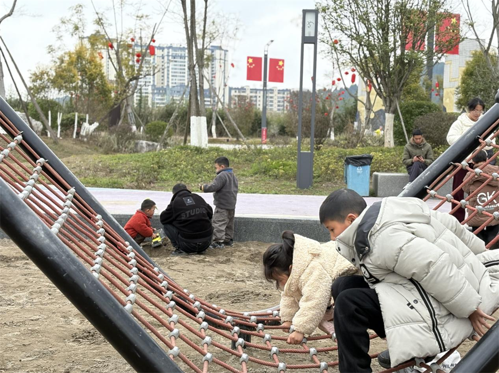 在国家3A级景区凤凰栖公园,儿童游乐区同样人气爆棚,呈现一片热闹盛景。小朋友们排着整齐队伍顺着滑道飞速而下,落地后又蹦蹦跳跳、兴高采烈地跑回楼梯处,等待下一次的滑行;秋千旁,孩子们随着秋千高高荡起,尖叫声与欢笑声交织在一起;攀爬架下,几个孩子手脚并用,小脸涨得通红,努力向上攀登,锻炼着自己的胆量和体力。