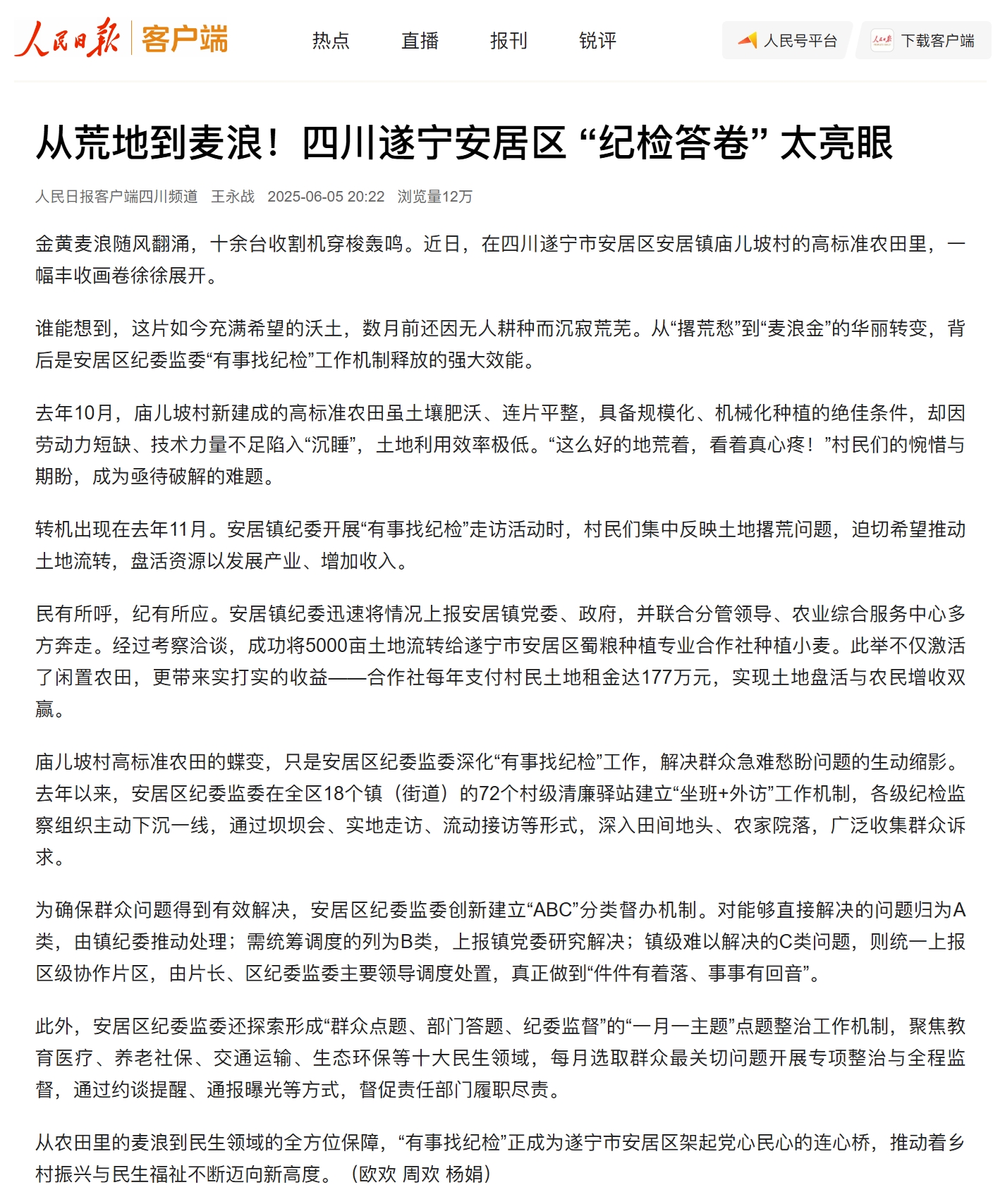 以“从荒地到麦浪!四川遂宁安居区 ‘纪检答卷’ 太亮眼”为题