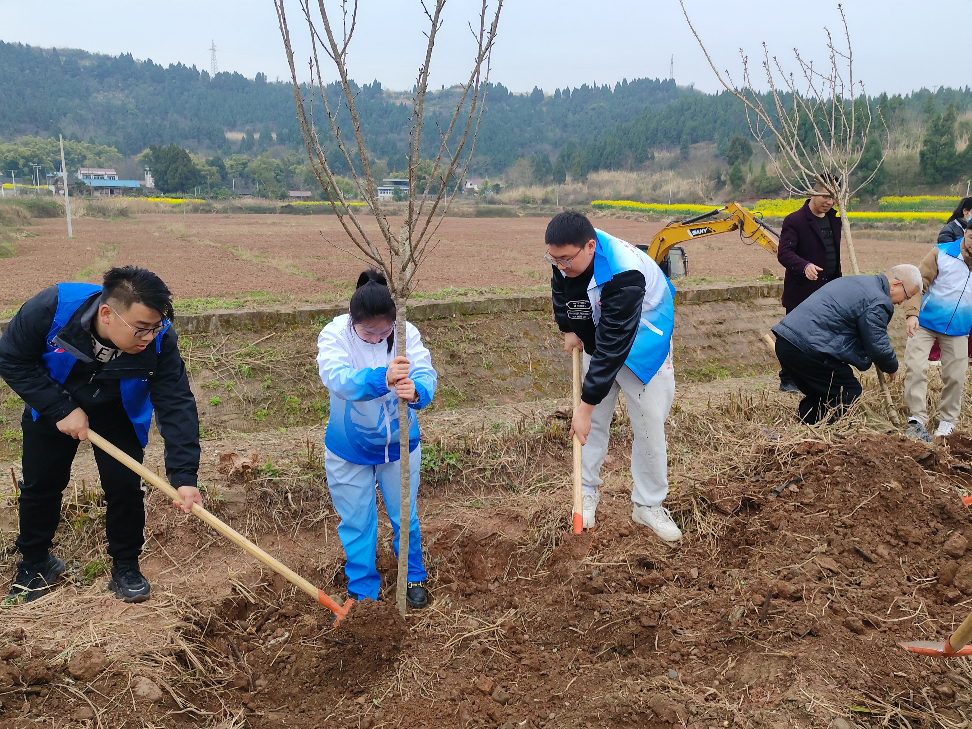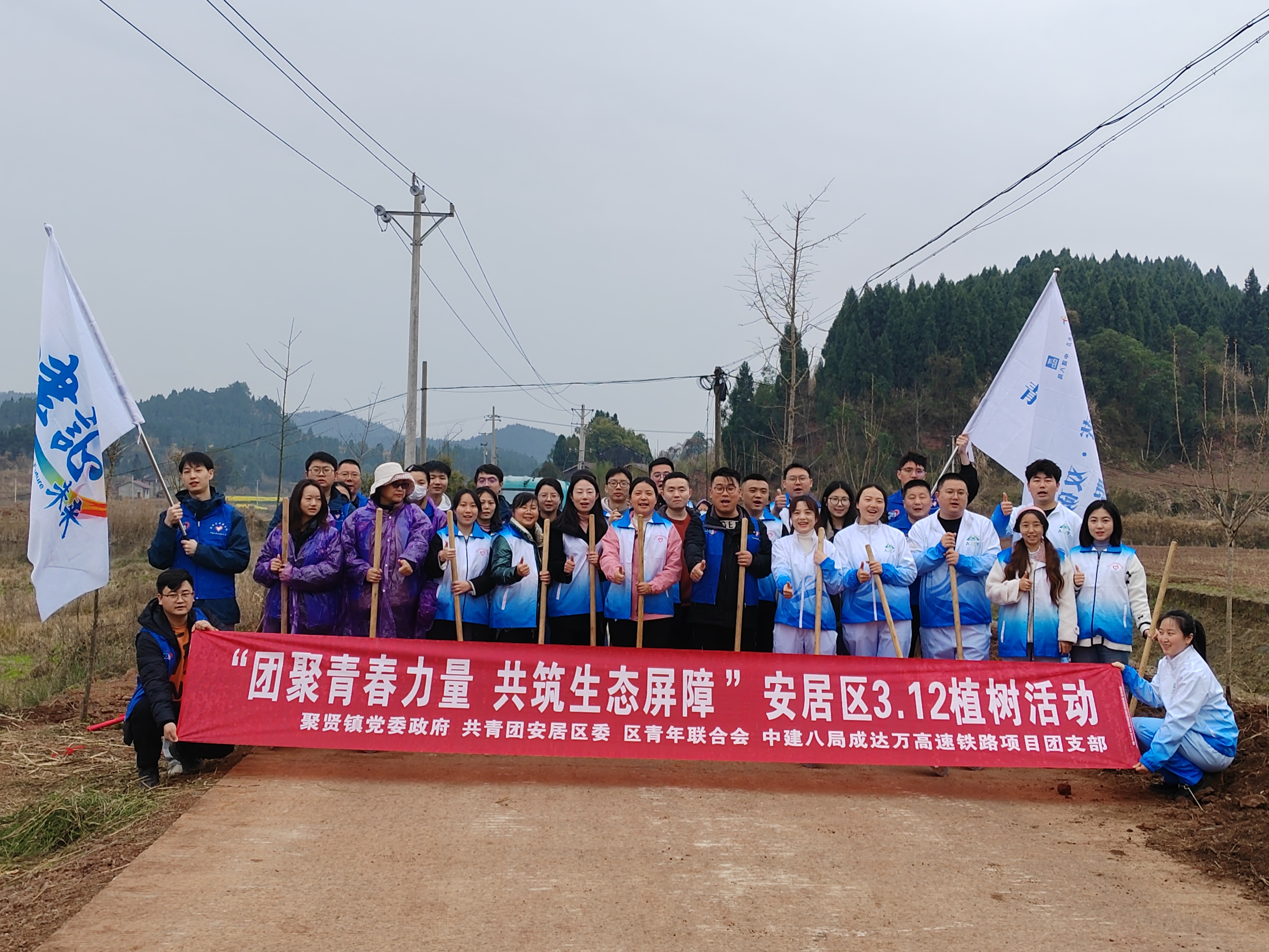 今年3月12日是全国第46个植树节,当天,共青团安居区委、聚贤镇党委政府、中建八局成达万高速铁路项目团支部在聚贤镇和平村联合开展“团聚青春力量 共筑生态屏障”义务植树活动。