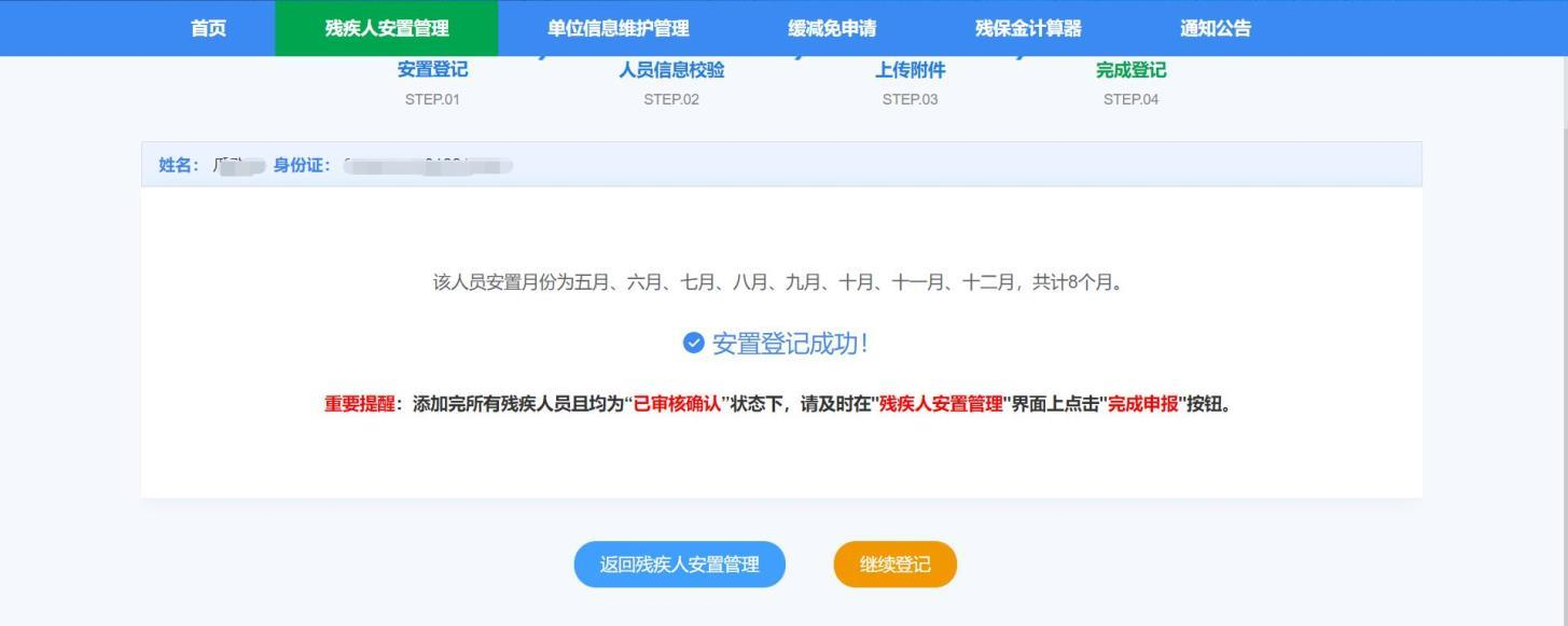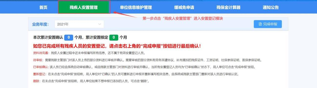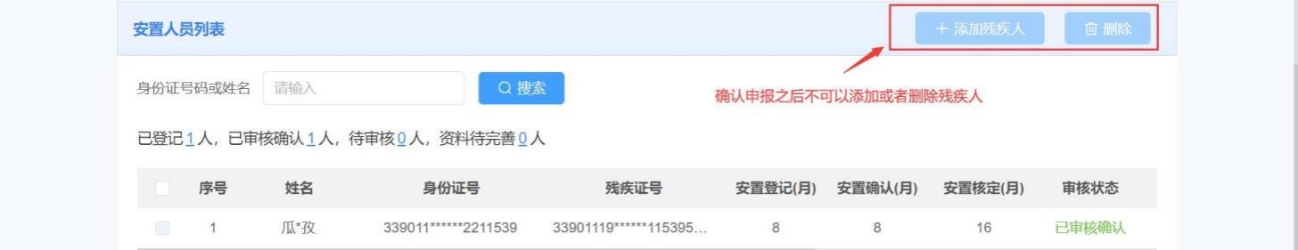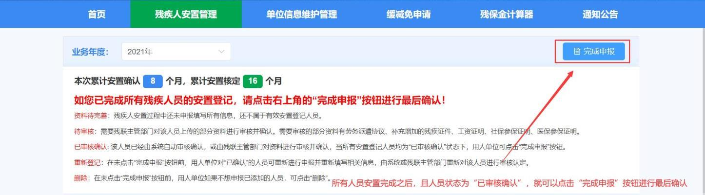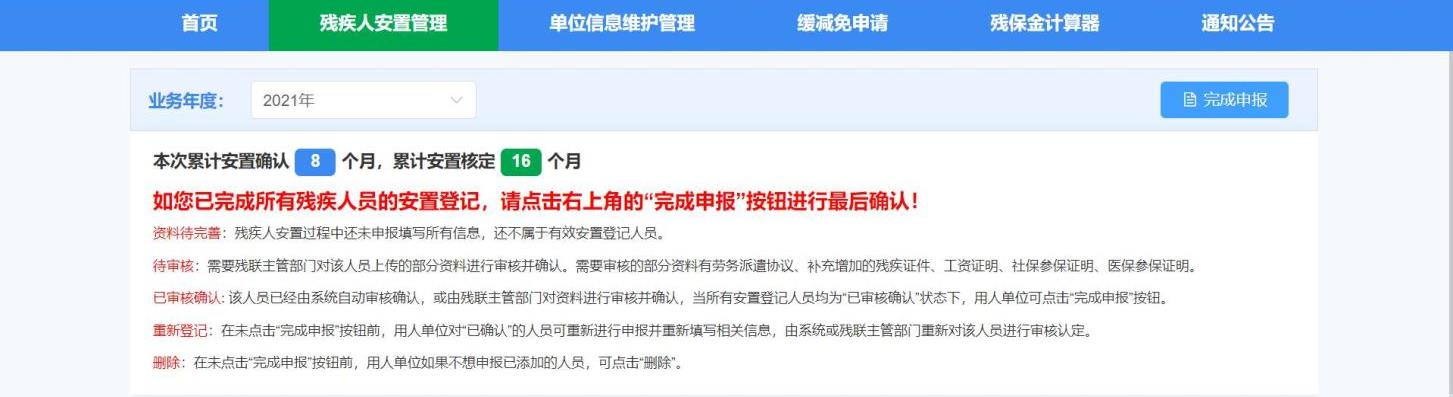 第六步:当完成所有残疾人员的安置登记之后,且安置登记人员的状态全部为“已确认”,则可以点击“完成申报”按钮。