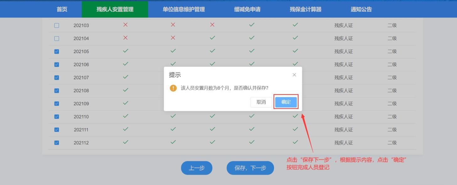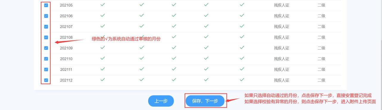 ① 系统默认勾选自动核验通过的月份,如果为非劳务派遣人员,则系统核验通过的月份强制申报,不允许取消,如果为劳务派遣人员,则用人单位可自行选择该残疾人员的安置登记月份。如果只勾选系统自动通过的月份,点击“保存下一步”,则该人员直接安置登记完成。