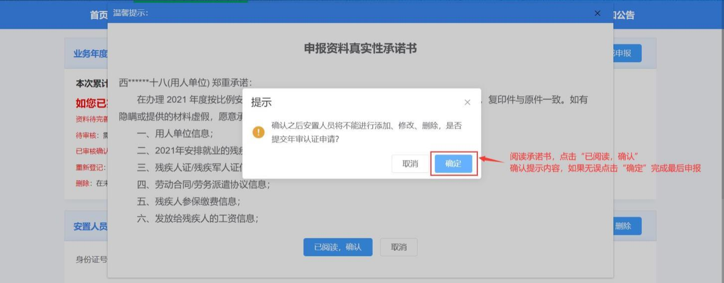 点击“完成申报”按钮,需要阅读承诺书。阅读完成之后点击“已阅读、确认”按钮,如果根据提示内容确认无误,则点击“确定”完成最后的确认申报工作。