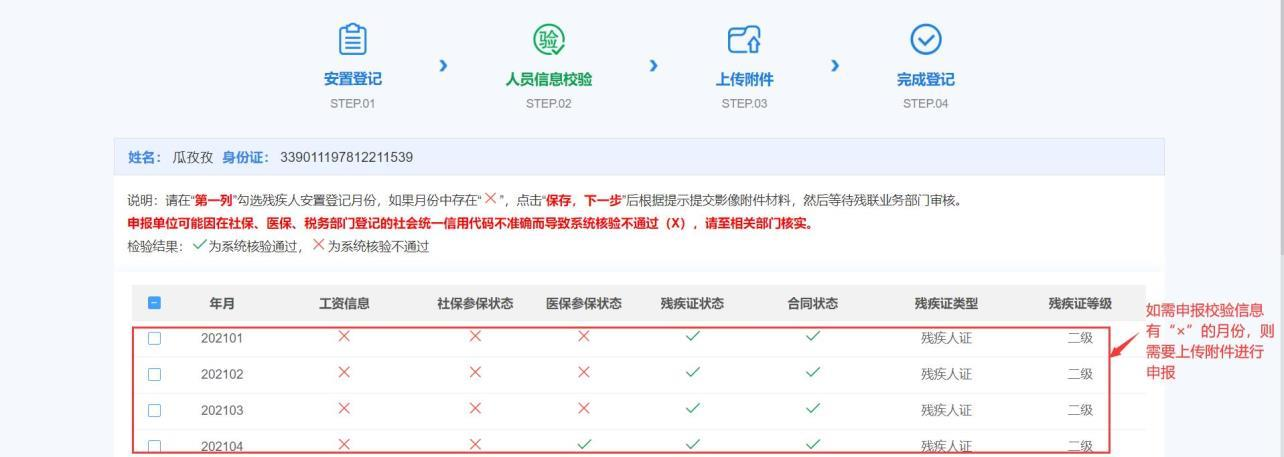 第四步:页面上每一列的 “√”为系统自动核验通过的月份,“Ⅹ”为系统核验失败的月份。其中“工资信息”表示该人员是否每月有工资发放记录,且发放工资≥当地的最低工资标准。社保参保状态、医保参保状态为该人员是否有社保、医保的参保缴费记录。残疾证状态是指该业务年内是否有有效的残疾证件信息。是否就业年龄段是指该人员是否在法定就业年龄段内。合同状态是指该人员在业务年度内是否有有效的合同。