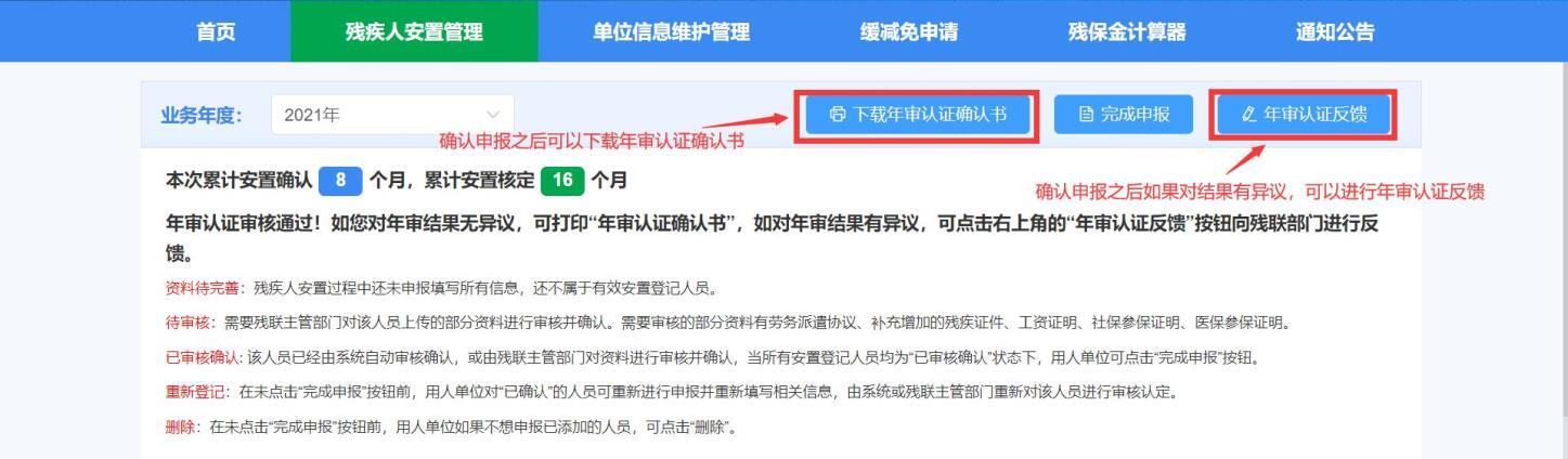第七步:完成申报之后,用人单位不能再进行残疾人员的添加、删除或者重新登记,如果想再添加、删除或重新登记,需要先进行年审认证反馈并填写理由,待残联业务部门审核通过后将取消前面的年审认证结果,用人单位可再重新办理残疾人员的安置登记。同时用人单位可“下载年审认证确认书”,完成申报后残联部门将会把安置登记信息发送给税务部门,用人单位可直接至税务部门缴纳残保金。