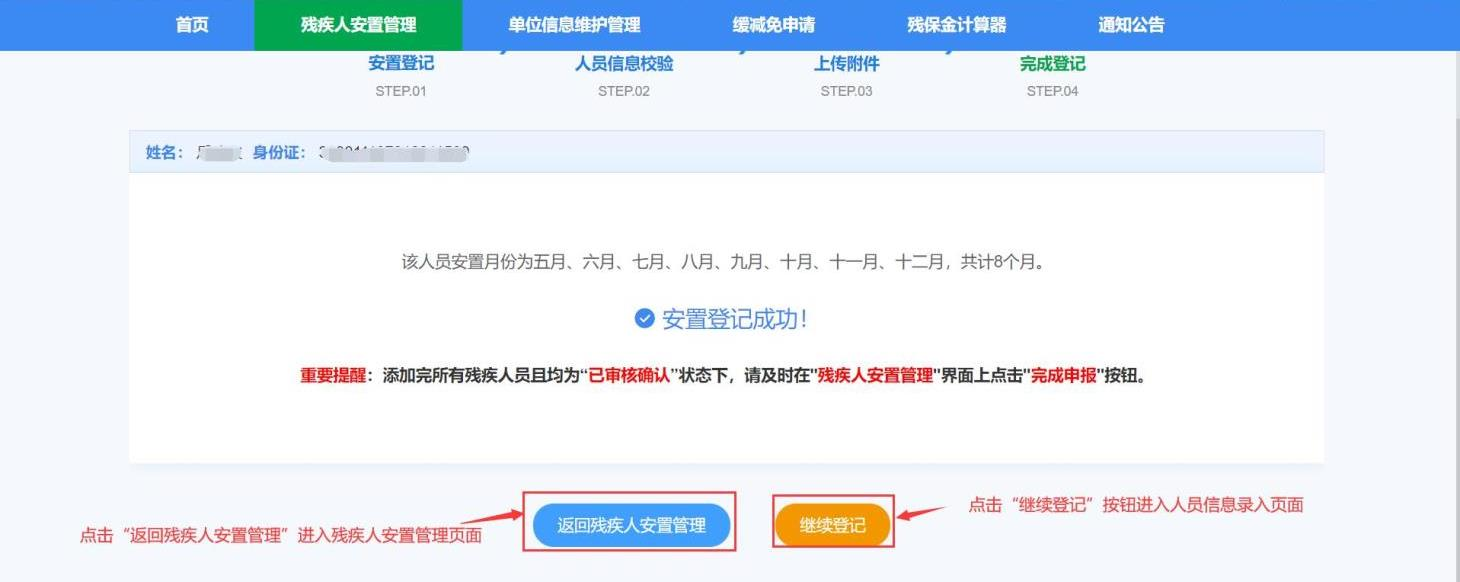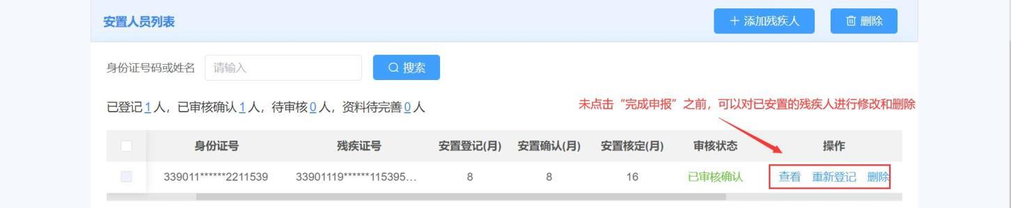 第五步:点击“返回残疾人安置管理”按钮回到残疾人安置管理页面,可以查看单位该业务年度安置情况和安置人员列表。可以对已安置的残疾人进行重新登记或者删除。