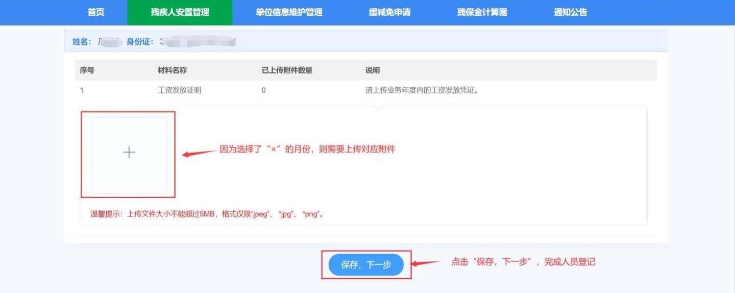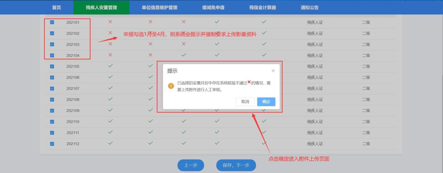 ② 如果用人单位想要申报并勾选带有“Ⅹ”的月份,则需要根据系统提示上传所对应的附件影像资料,且该月份需要残联业务部门进行审核。(如下图所示中勾选带有“Ⅹ”的 1 月至 4 月)