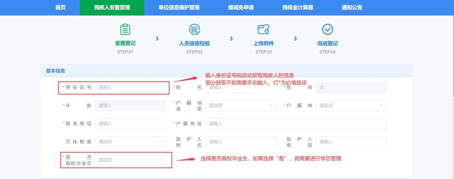1、输入身份证号,自动获取残疾人员的信息。如果获取不到,需要填写并完善带*部分的内容;