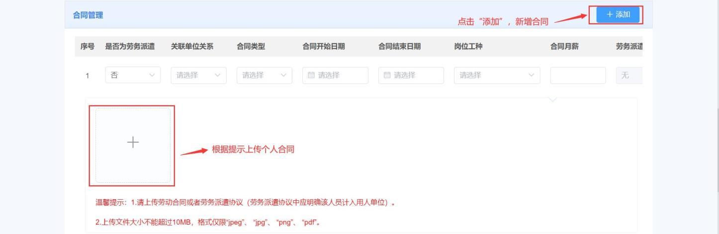 3、点击“添加”,按钮,新增合同信息,上传个人劳动合同附件。如果人员为劳务派遣,则协议中应明确该人员残疾人安置登记计入用人单位;(下图所示)