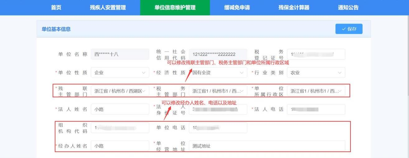 第一步:点击“单位信息维护管理”进入该模块,残联主管部门为用人单位年审认证的办理所在地、税务主管部门为用人单位缴纳残保金的所在地、行政所属区为用人单位注册登记的所在地。同时需要填写所有带*的内容,比如经办人姓名和电话等。
