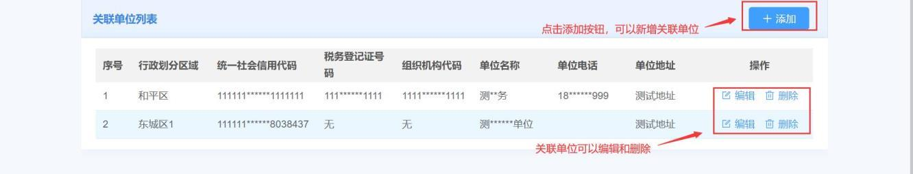 第三步:如果用人单位安置登记的残疾人员其工资、社保、医保在子公司,或者安置登记的残疾人员为劳务派遣人员,则在上图中点击“添加”按钮,添加关联单位,已有的关联单位,已有的关联单位可以编辑和删除。