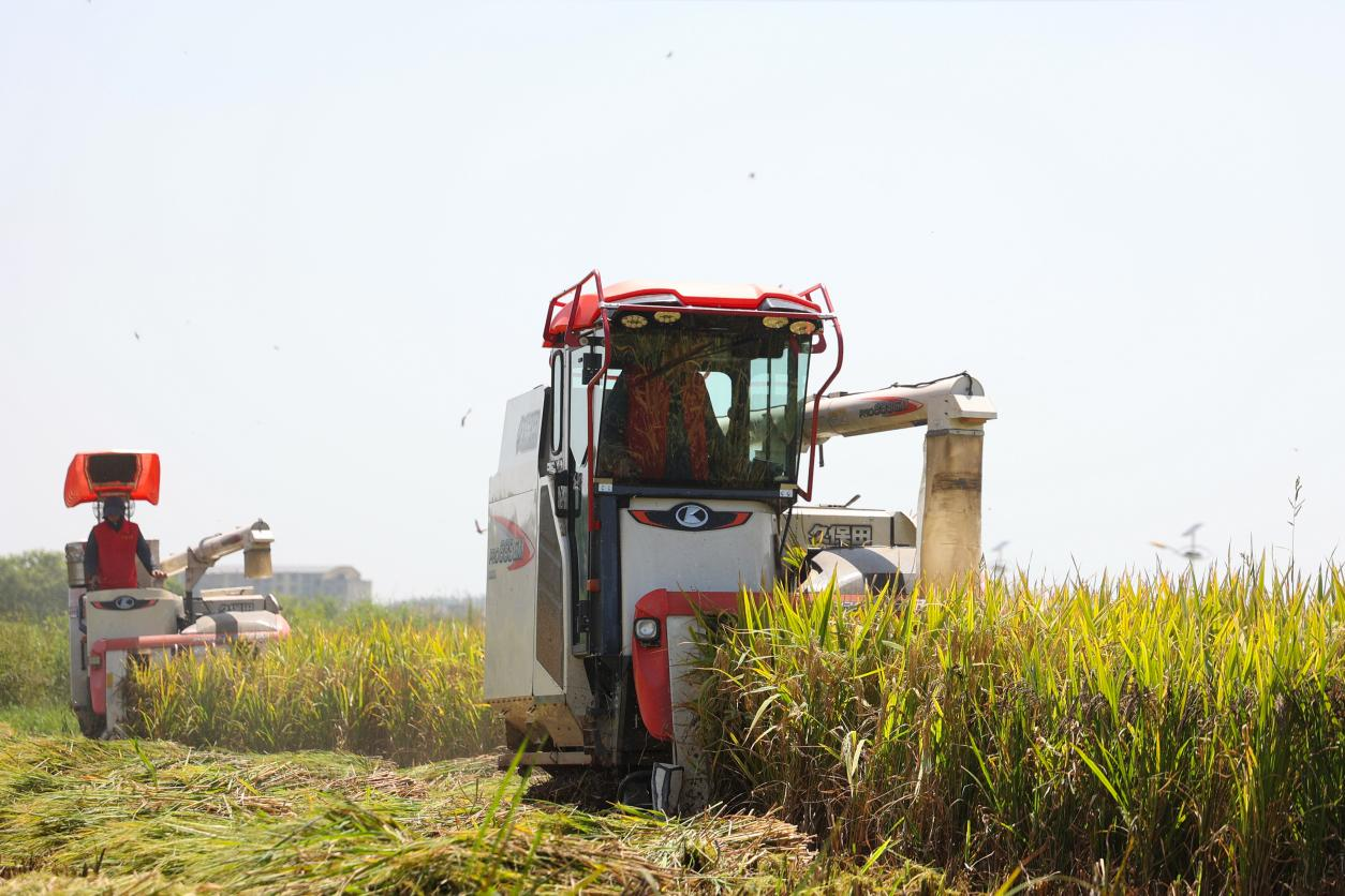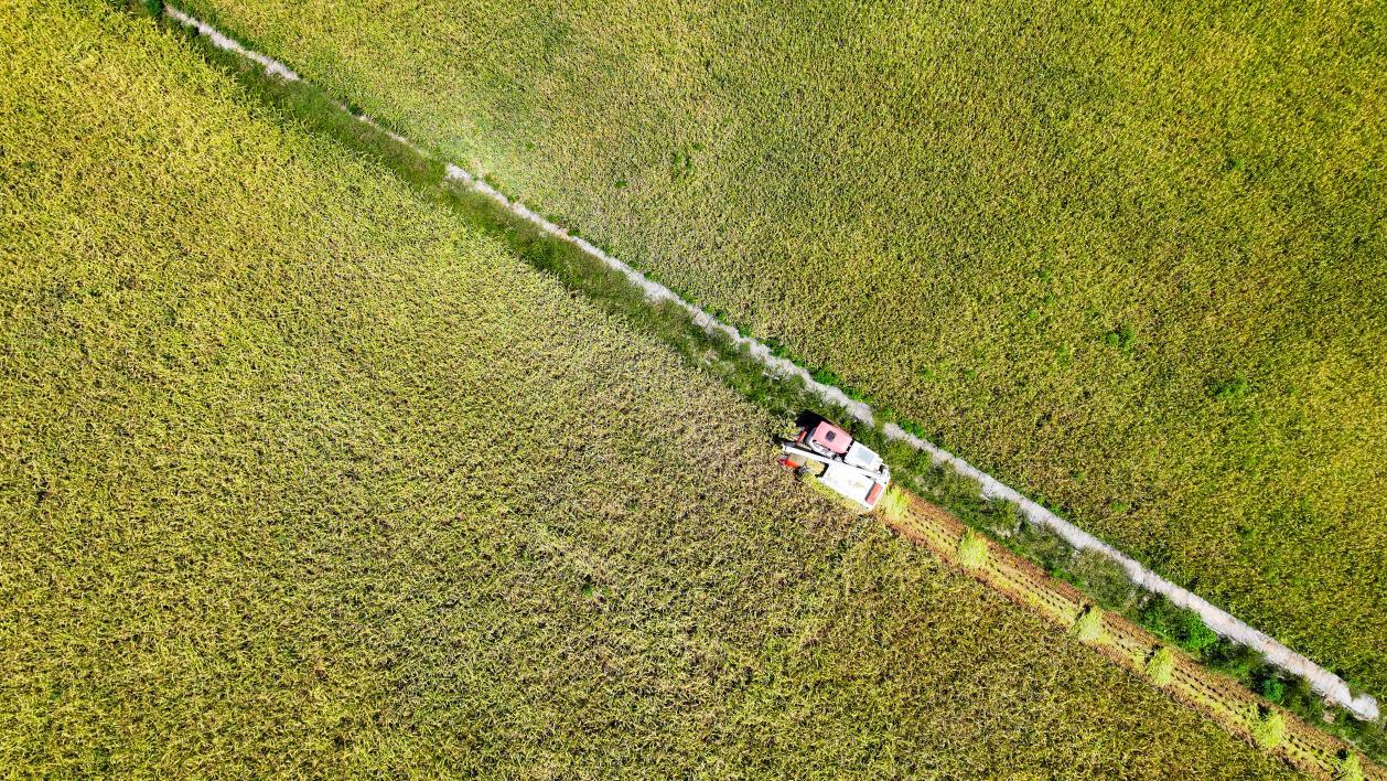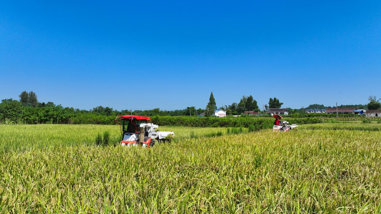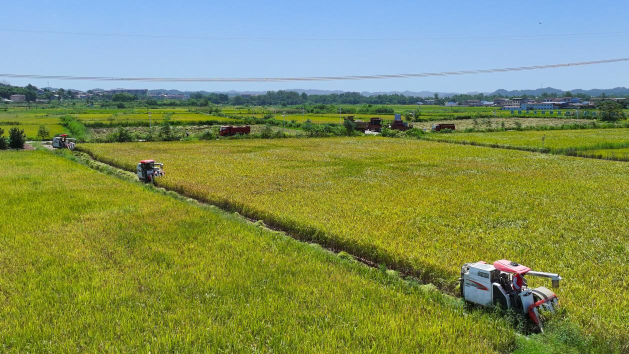 8月11日,在安居区三家镇三门村,当地种粮大户抢抓晴好天气,组织收割机在稻田里来回穿梭,确保秋粮颗粒归仓。今年安居区种植水稻25.8万亩,目前已陆续进入成熟期,预计9月中旬收获完毕。