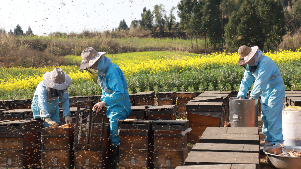 3月11日的安居区石洞镇老庙村,路边亩亩油菜花竞相绽放,蜂鸣阵阵,循声望去,一排排蜂箱整齐排列,成群的蜜蜂飞进飞出,或围绕蜂箱飞舞,忙着酿制春天里的百花蜜。