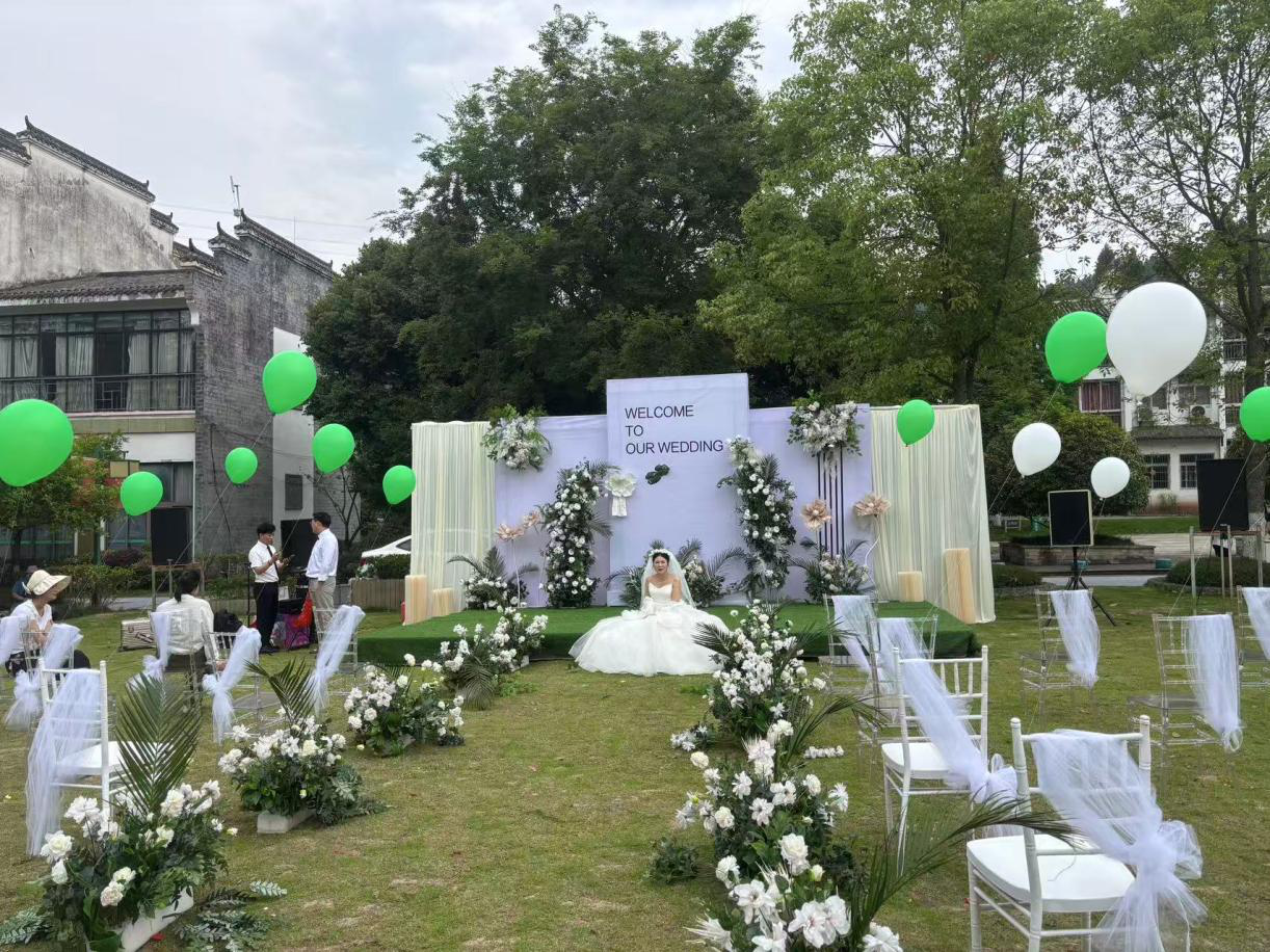 婚礼现场依托景区天然草坪景观,以纯白鲜花拱门为主背景,搭配轻盈纱幔与错落绿植,既保留自然的清新野趣,又赋予仪式优雅的格调。新人在亲友祝福中许下誓言,远处层峦叠翠,近处花香浮动,宛如一幅流动的山水画卷。