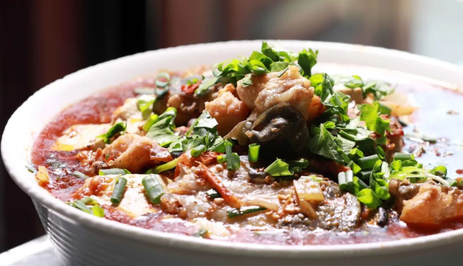 跑马滩砣砣鱼,堪称安居美食中的“硬核担当”。选用野生青鱼,搭配老豆腐、坛子肉和老坛酸菜,经过“和、弦、勾、扑、射”五道复杂工序精心烹制而成。鱼肉紧实Q弹,每一口都充满了鲜香;酸辣入味的汤汁,醇厚浓郁,喝上一口,浑身都暖乎乎的。