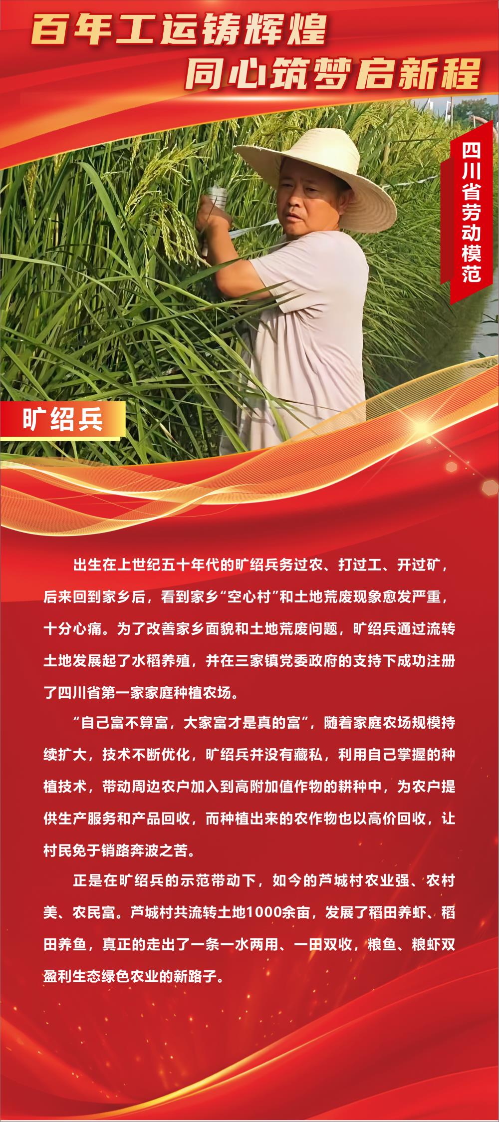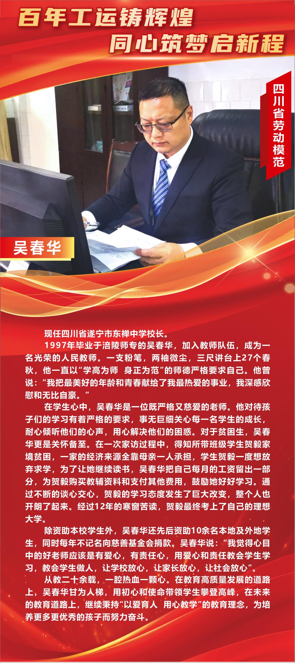为深入学习贯彻习近平总书记关于工人阶级和工会工作的重要论述,庆祝中华全国总工会成立100周年,奏响“中国梦•劳动美”时代主旋律,团结动员全区广大职工为“突破300亿、争创百强区”贡献积极力量。在第135个“五一”国际劳动节来临之际,遂宁市安居区总工会以海报的形式陆续展播区内16名劳模工匠的风采,进一步营造“致敬劳动者,奋进新征程”浓厚社会氛围。