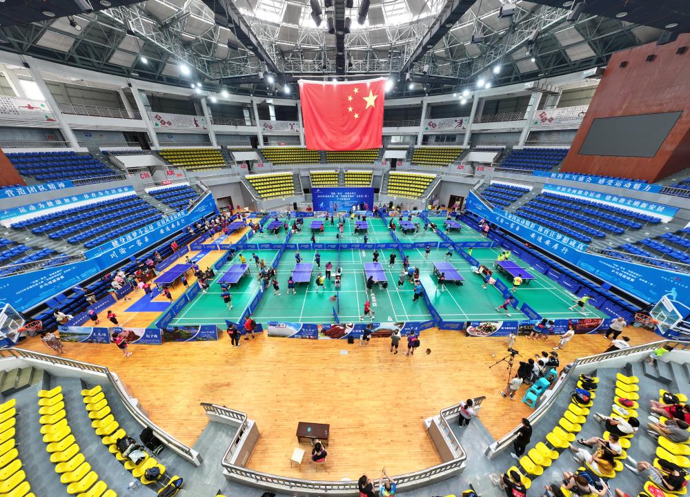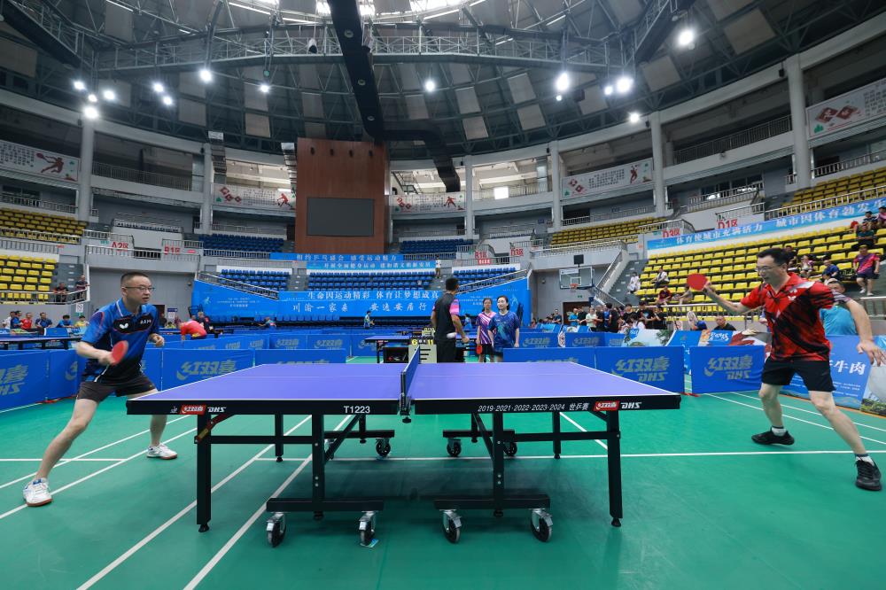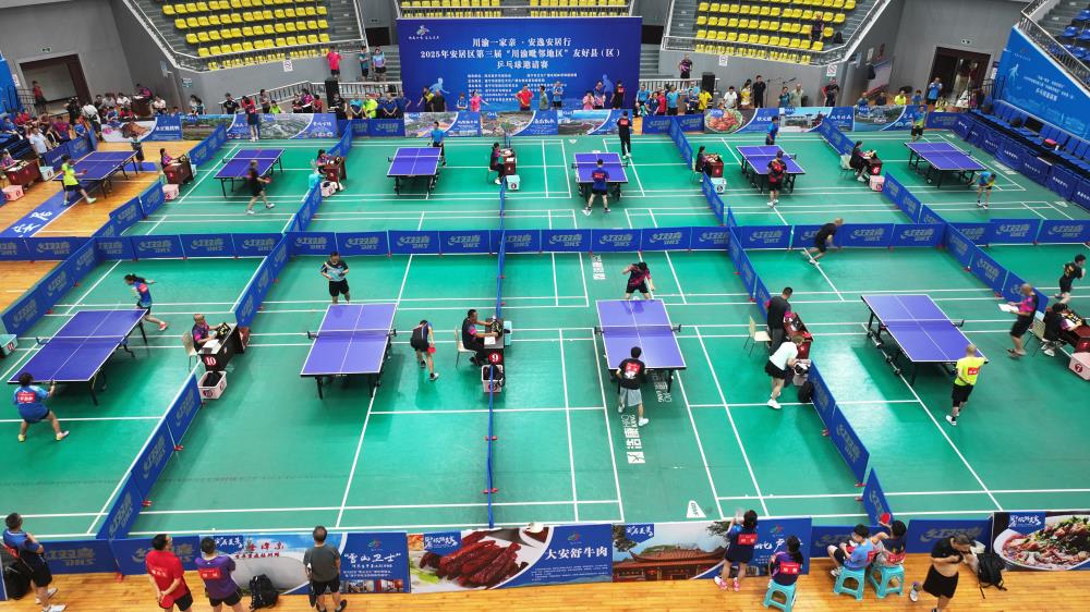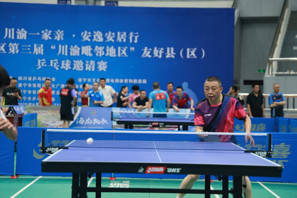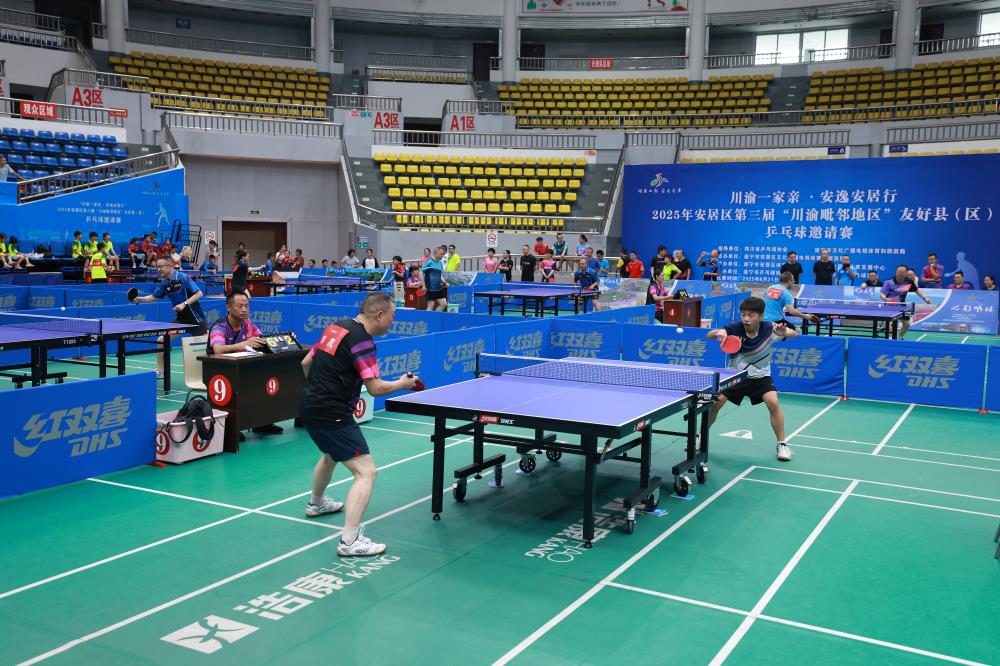 6月21日,“川渝一家亲·安逸安居行”2025年安居区第三届“川渝毗邻地区”友好县(区)乒乓球邀请赛在安居区体育中心开赛,来自重庆潼南、铜梁,资阳安岳、乐至等川渝毗邻地区的16个区(县),共32支队伍、300余名运动员参赛。