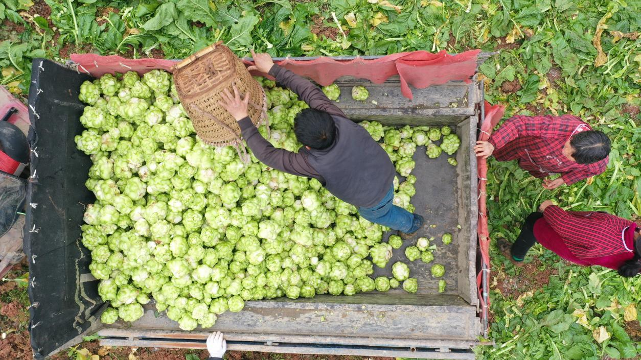 △1月18日,在玉丰镇黄林沟村,3000亩儿菜迎来丰收,村民正将儿菜搬运装车