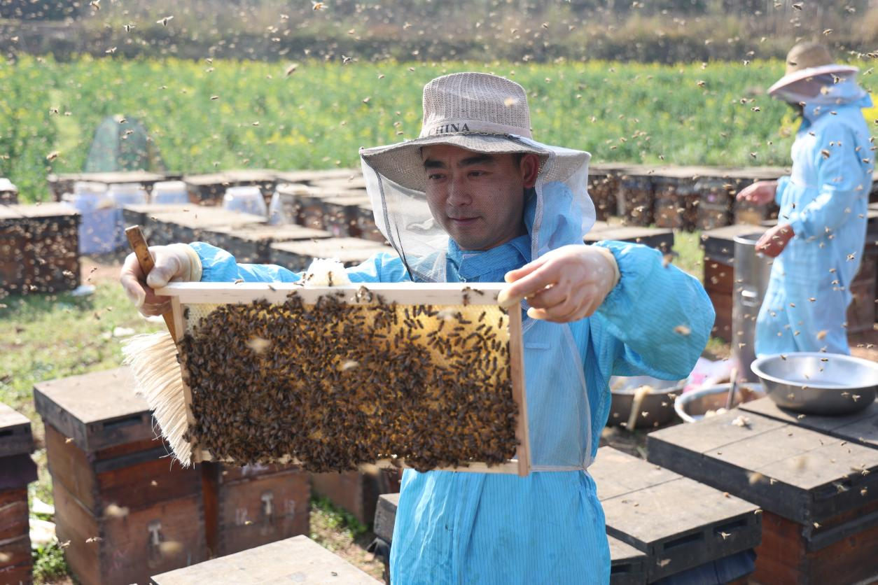 △3月11日,在石洞镇老庙村的养蜂基地,蜂农正采收蜂蜜